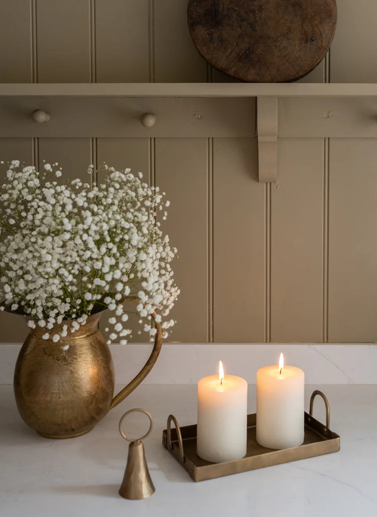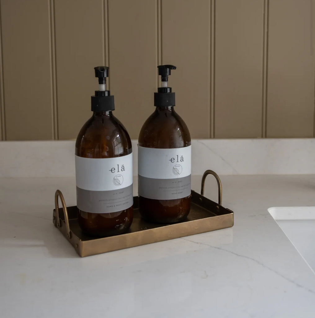 Brass rectangular tray with handles. Use to style candles, for hand soaps and lotions by a sink or for perfume or jewellery in your bedroom.